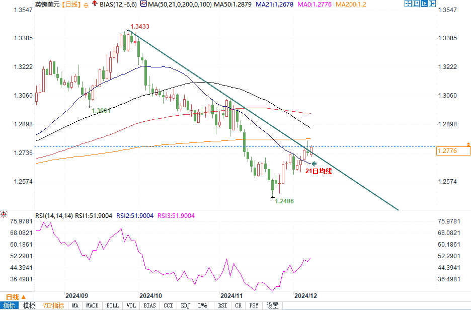 英镑兑美元触及下降趋势线,若能够有效突破,将是短期反弹的重要信号。与此同时,汇价已站上21日均线,这是行情转多头的首个关键均线。而14日RSI也已升至50以上,并持续向上,显示短期内可能继续走强;