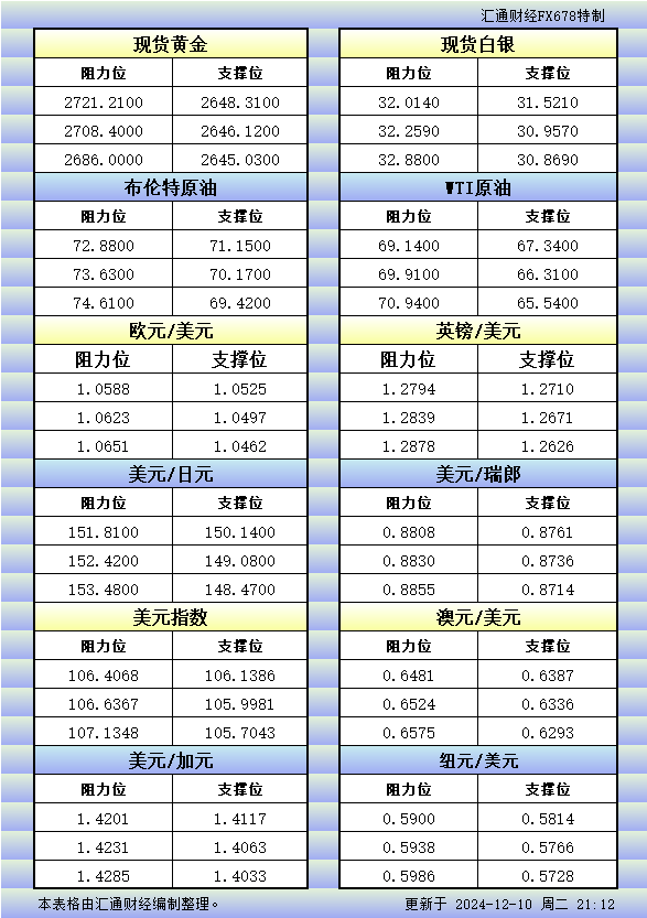 标题:12月10日美市更新的支撑阻力:金银原油+美元指数等八大货币对