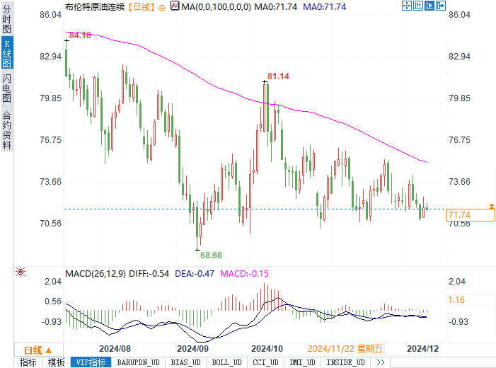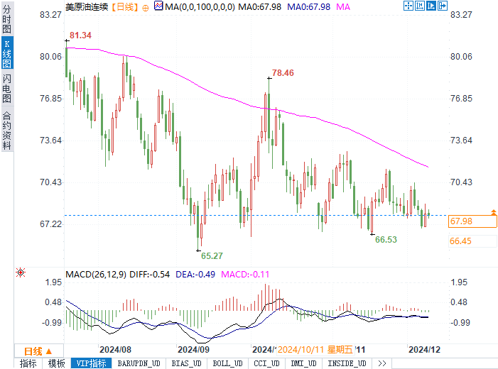 美原油报67.98美元/桶,下跌0.59%。尽管周一原油市场曾因中国政策刺激预期上涨,但周二价格回落反映出市场对叙利亚局势影响有限。尽管叙利亚本身不是主要产油国,但其地缘位置及与俄罗斯和伊朗的联系,使市场对区域局势扩大的风险保持警惕。然而,分析师指出,“中东紧张局势似乎得到了控制,这降低了油价因区域冲突扩大而大幅波动的可能性。”