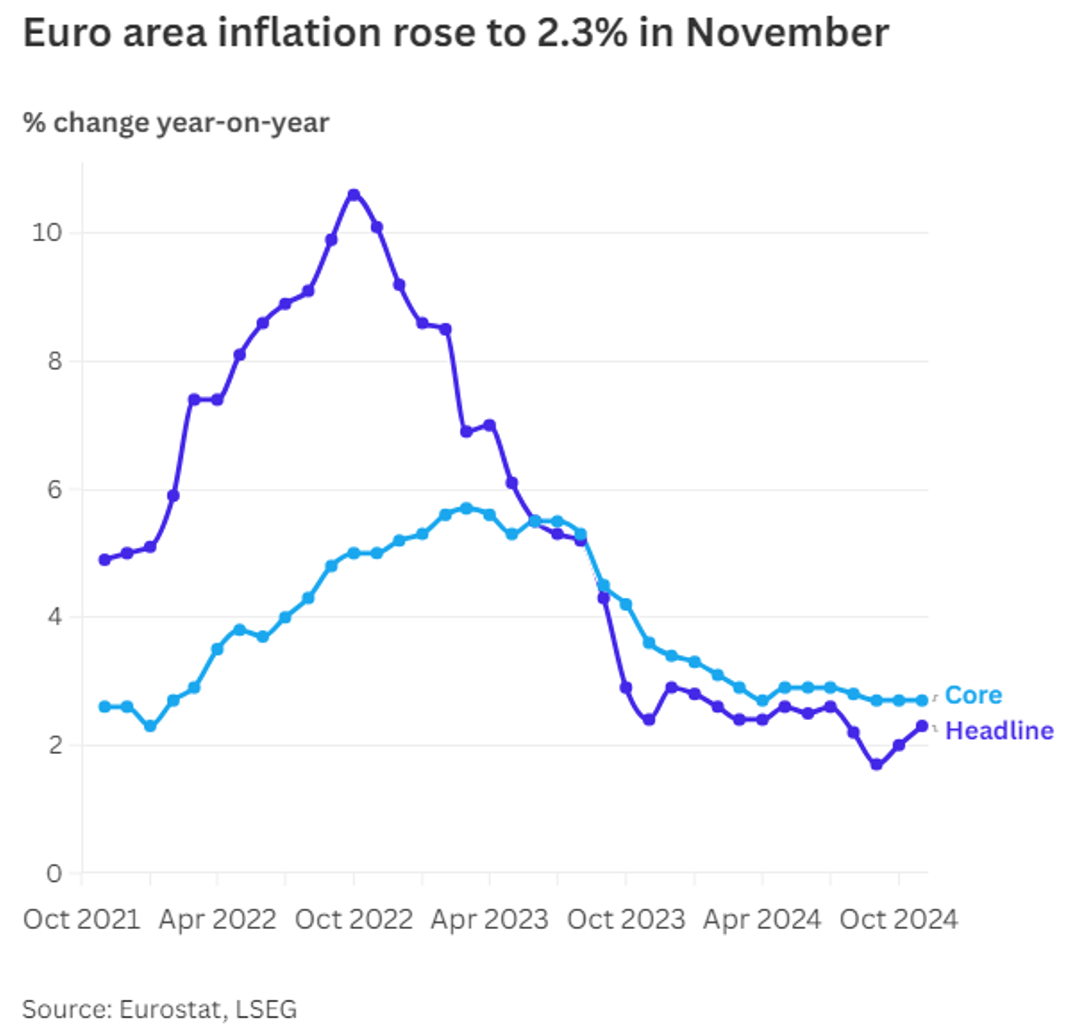 11月欧元区通胀率重回目标水平以上,从10月的2%升至2.3%。与此同时,欧元区经济在第三季度以0.4%的速度实现两年来最快的增长。