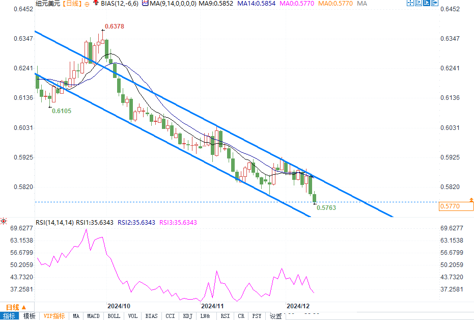 纽元兑美元的即时支撑位在2023年11月触及的两年低点0.5772。如果跌破这一水平,可能进一步增强空头情绪,并推动汇价接近下降通道下边界的0.5720水平;