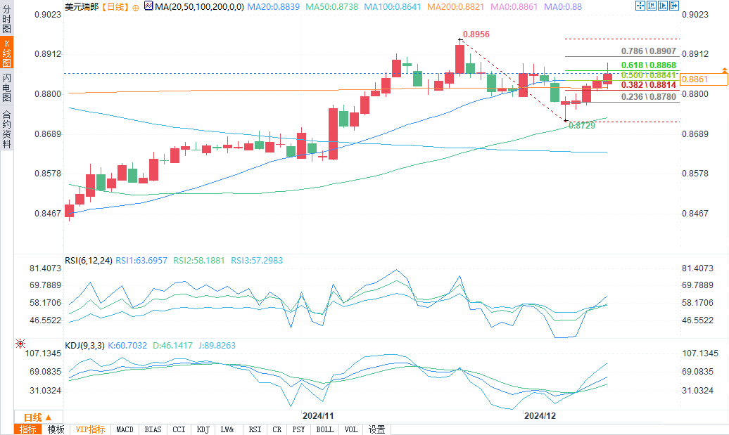 瑞士央行行动后扩大了美元/瑞郎从0.8725(12月6日的最高价)的反弹,连续第五天复苏,上破了0.8957 - 0.8725的61.8%斐波那契回撤位,也在0.8890附近削弱了下平台。