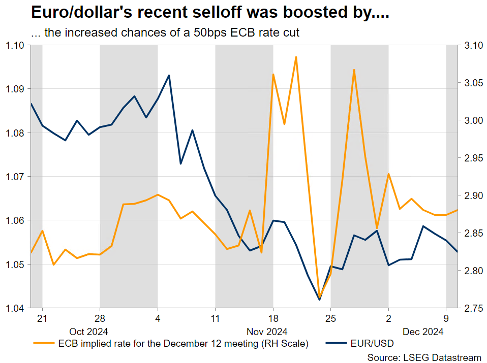 (欧元/美元近期被抛售,显示欧洲央行降息50基点的几率增加)
