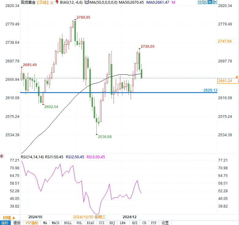 12月13日周五,黄金承受下行压力,在50日均线上下波动。目前金价已跌破2663.51,可能进一步下探2629.13;相反,若突破2693.40,可能引发看涨动能,上探2726.30;