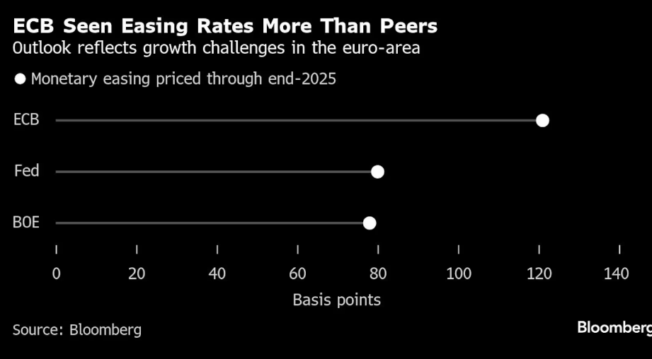 欧盟两大经济体的政治动荡,加上特朗普重返美国总统职位可能给全球贸易带来冲击,这支持了比其他国家更积极降息的理由。美联储和英国央行预计到明年年底将借贷成本降低约 80 个基点。 相比之下,欧洲央行周四降息 25 个基点,降息幅度约为 125 个基点。