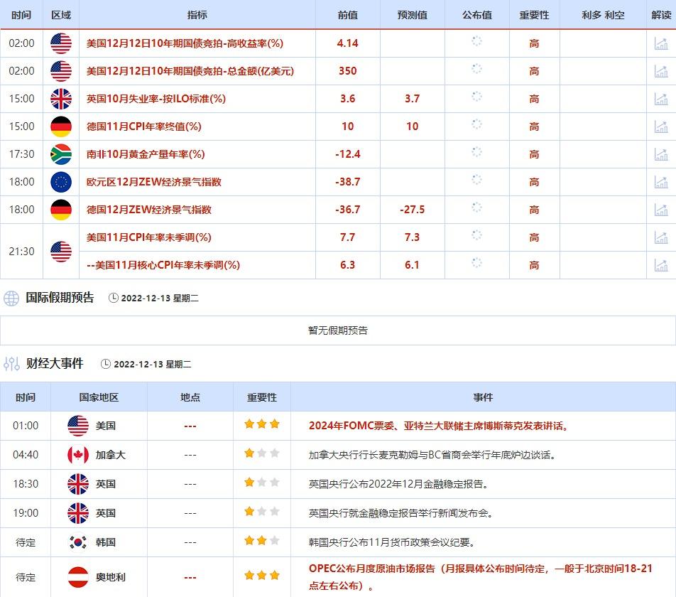 12月13日当天,投资者还需关注亚特兰大联储主席博斯蒂克发表讲话,以及OPEC公布的月度原油市场报告。