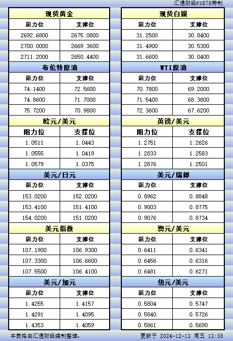 标题:12月13日亚市更新的支撑阻力:金银原油+美元指数等八大货币对