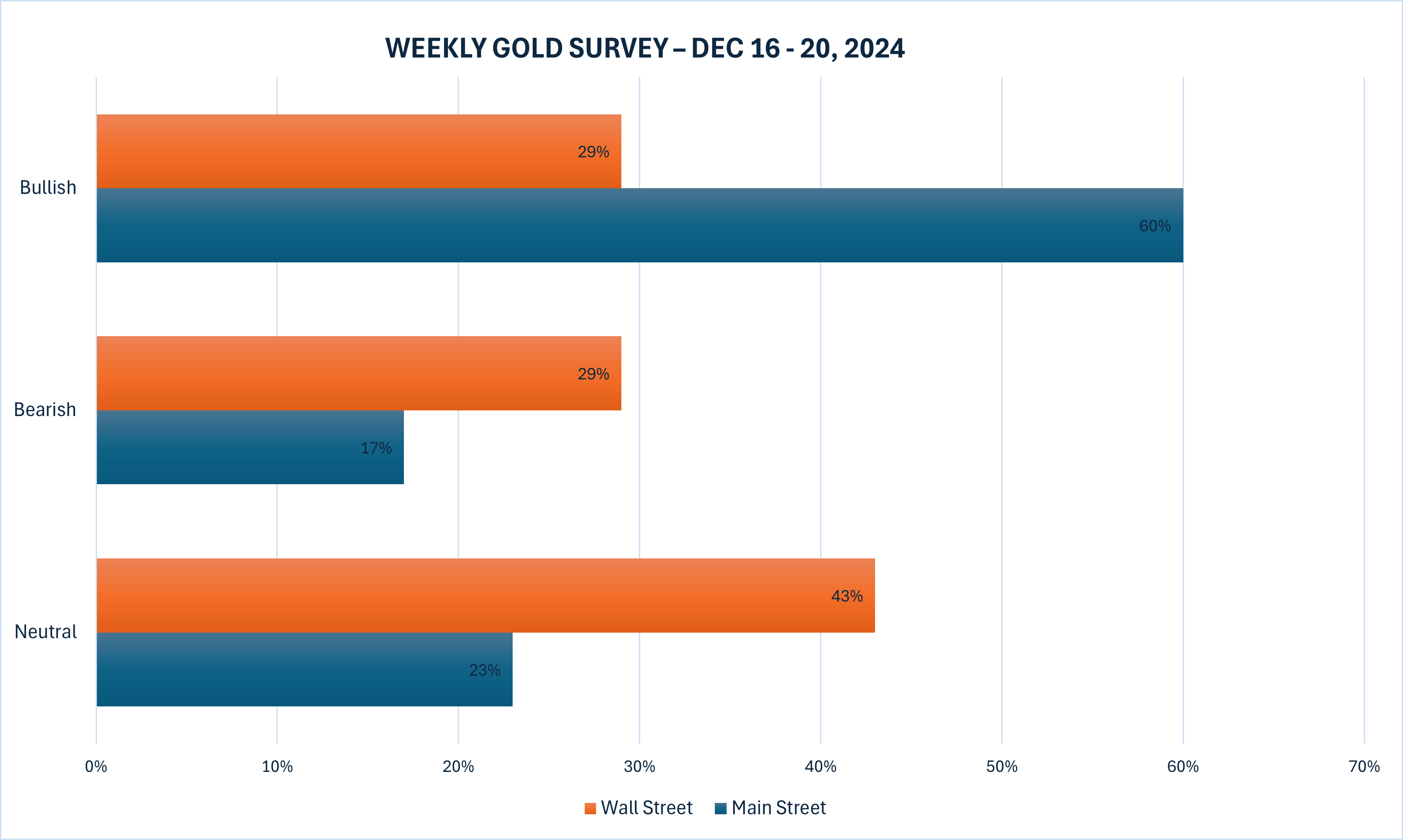 最新的 Kitco News 每周黄金调查显示,行业专家在看涨和看跌态度之间完美平衡,多数受访者持中立态度,而散户交易商的看涨情绪与前一周相比没有变化,近六成倾向于看涨后市,看空比例仅17%,剩余的23%则认为金价后市偏向震荡。