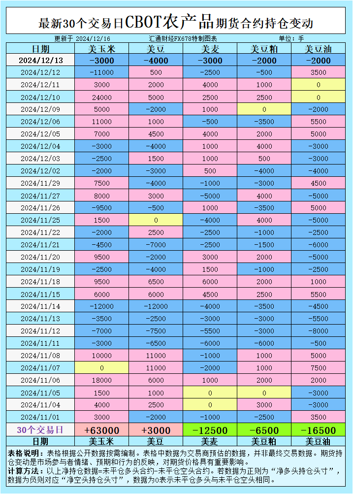 增加CBOT玉米投机性净多头;增加CBOT大豆投机性净多头;增加CBOT小麦投机性净多头;增加CBOT豆粕投机性净多头;增加CBOT豆油投机性净空头;