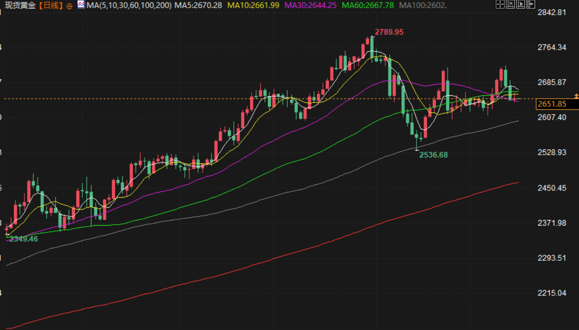 现货黄金交投于2651.83附近,尽管金价受到美联储降息预期和央行购金的支撑,但是复杂环境下,市场保持谨慎,获利了结限制金价涨幅;