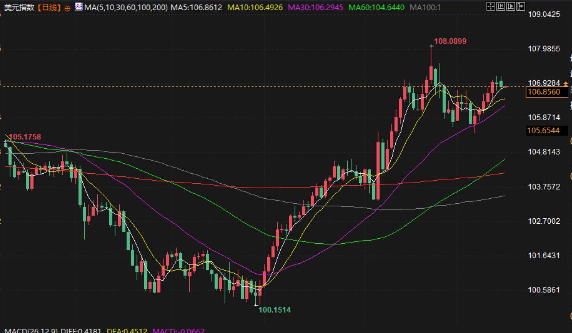 美元兑主要货币周一在震荡交投中走高,尾盘小涨,报106.88点,盘中一度升至107.16,投资者关注美联储、日本央行、英国央行等主要央行本周的利率决定。