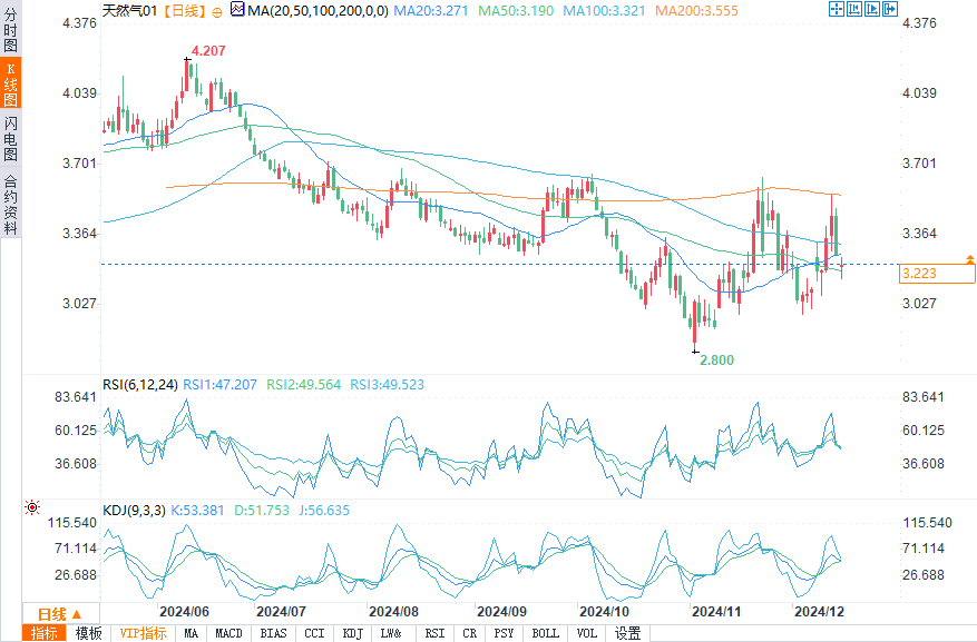 周一(12月16日)美盘时段,美国天然气期货大幅下跌,开盘出现下行缺口,因基本面看跌打压市场。产量保持在高位,Wood Mackenzie预计周一产量为1038亿立方英尺/天。尽管这一数字略低于上周五的1047亿立方英尺/天,但与最近7天的平均水平一致,突显出持续的供应过剩担忧。由于产量没有受到重大影响,交易员对市场的上行潜力仍持谨慎态度。