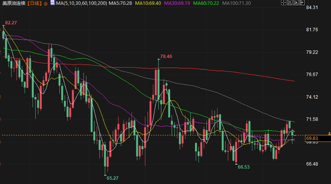 美原油交投于69.80美元/桶附近,投资者在关注美联储决议的同时,需求担忧拖累油价涨幅。