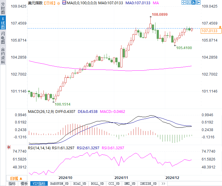 美元指数(DXY)上涨0.2%,目前交投于107.0252。近期的经济数据进一步加大了美联储逐步降息的可能性,特别是美国服务业采购经理人指数(PMI)攀升至三年高点,而亚特兰大联储的GDPNow模型预测第四季度GDP增长为3.3%。尽管市场普遍预期美联储将在本次会议上降息25个基点,但市场焦点已转向2025年的货币政策走势。外汇市场普遍认为美联储将在明年继续采取谨慎的降息策略,而未来的降息幅度可能远低于当前的预期。