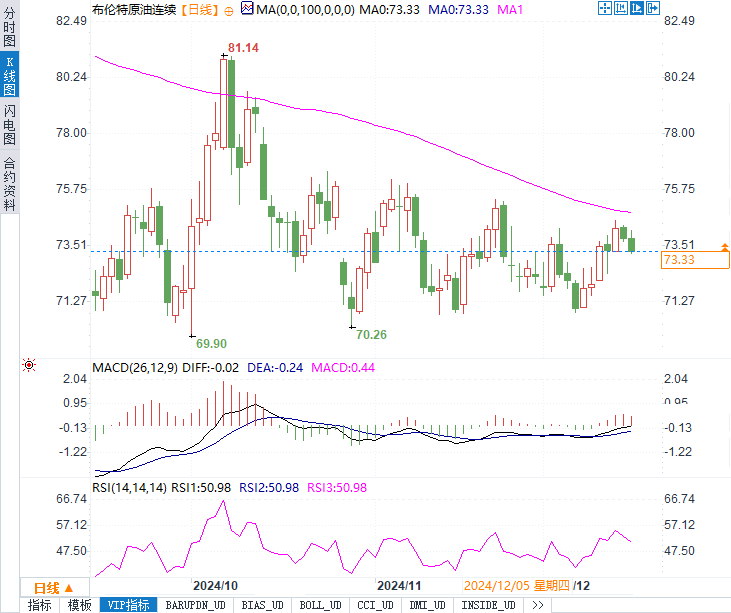 美原油的价格分别下跌至73.33美元/桶和69.67美元/桶,日内分别下跌0.71%和0.88%。尽管上周油价曾经历一轮上涨,但投资者本周选择获利回吐,且市场对需求增长的担忧加剧。