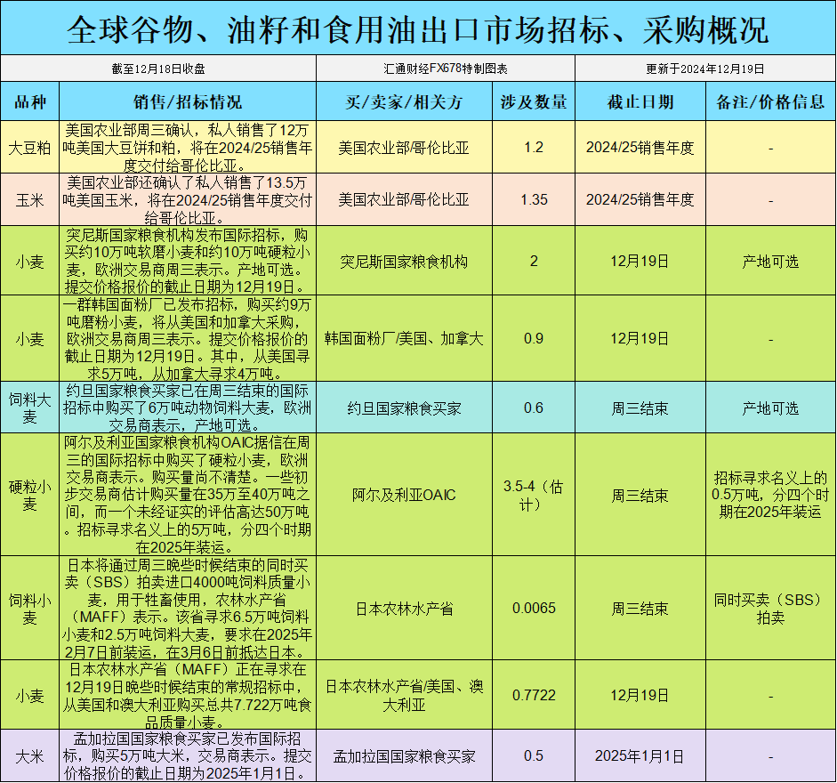 2024年12月19日,小麦期货市场表现不一。K.C.硬红冬小麦(HRW)期货跌幅较小,结束时下跌3-3/4美分,收于每蒲式耳5.48-3/4美元。近期,市场对全球小麦供应的评估继续加剧波动。尽管俄罗斯小麦生产预测被下调至7870万吨,创下数十年来的最低水平,但来自澳大利亚和阿根廷的小麦丰收预期依然令市场维持一定的供应压力。此外,阿尔及利亚国家粮食机构的采购需求也为市场带来了一定支撑。阿尔及利亚此次招标的采购量可能达到35-40万吨,而美国和加拿大均为潜在供应商。
