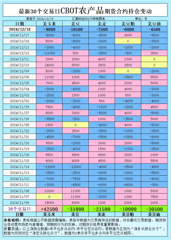 增加CBOT玉米投机性净空头;增加CBOT大豆投机性净空头;增加CBOT小麦投机性净空头;增加CBOT豆粕投机性净空头;增加CBOT豆油投机性净空头;