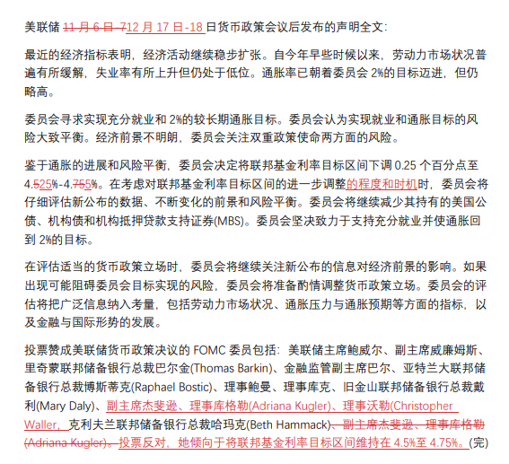 鉴于通胀的进展和风险平衡,委员会决定将联邦基金利率目标区间下调0.25个百分点至 4.25%-4.5%。在考虑对联邦基金利率目标区间的进一步调整的程度和时机时,委员会将仔细评估新公布的数据、不断变化的前景和风险平衡。委员会将继续减少其持有的美国公债、机构债和机构抵押贷款支持证券(MBS)。委员会坚决致力于支持充分就业并使通胀回到2%的目标。