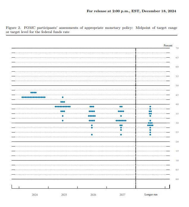 点阵图美联储12月点阵图中值显示,美联储预期2025年将降息两次,每次25个基点,9月份预期为降息四次,每次25个基点;美联储预期2026年将降息两次,每次25个基点,与9月份预期一致。