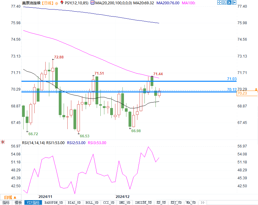 WTI原油价格似乎难以有效突破70.00美元水平,过去六个交易日内,原油价格均回归至这一水平附近。随着市场流动性逐渐减弱,70美元很可能成为2024年最后几个交易日的稳定水平;