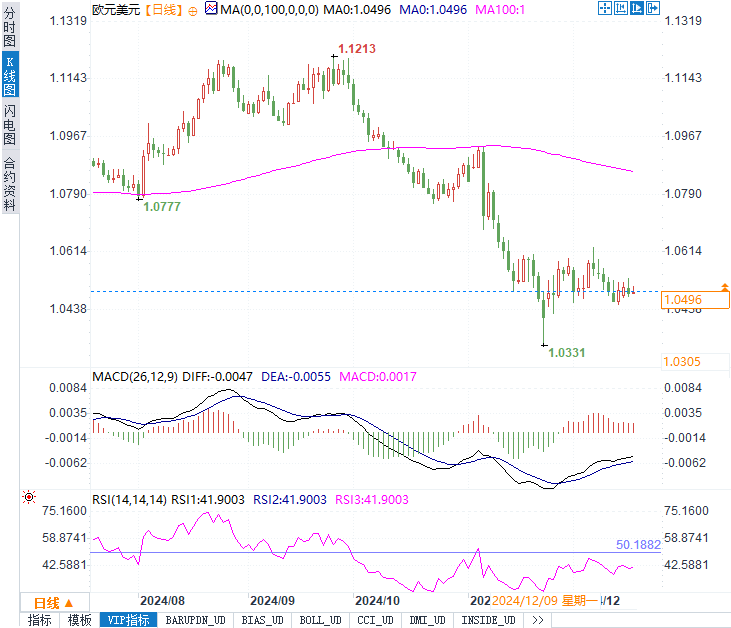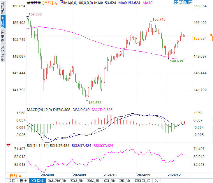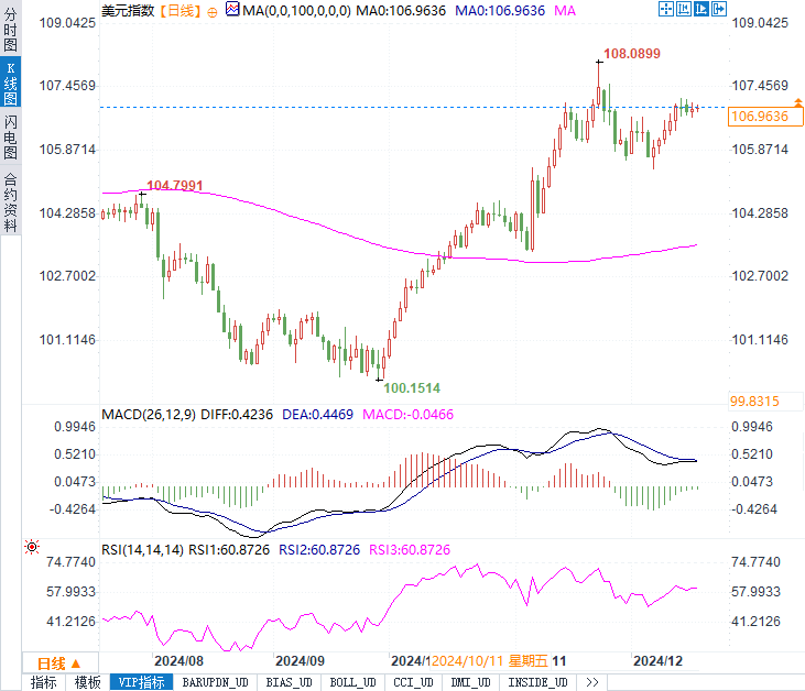 美元指数今日小幅上涨至106.98,维持在11月26日以来的最高点附近。市场已经基本消化了美联储此次降息25个基点的预期,焦点转向美联储对于2025年降息步伐的预测。如果点阵图显示美联储将更为谨慎,仅进行少量降息,美元可能会维持强势,进一步加大对其他货币的压力。