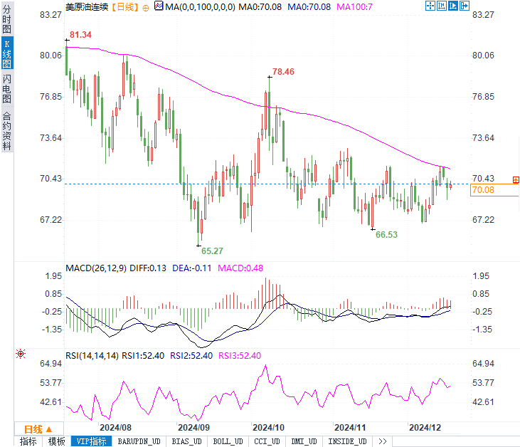 此外,美国石油协会(API)昨日公布的数据显示,截至12月13日当周,美国原油库存下降了469万桶,这一数据也为油价提供了支撑。然而,尽管库存数据表现强劲,油市的上涨空间依然受到其他不确定因素的制约,包括美联储未来的利率路径以及全球经济的增长前景。当前,市场普遍认为美联储将降息25个基点,并可能在2025年进一步放缓降息步伐,这种政策预期为美元提供了支撑,并可能间接限制油价的上涨。