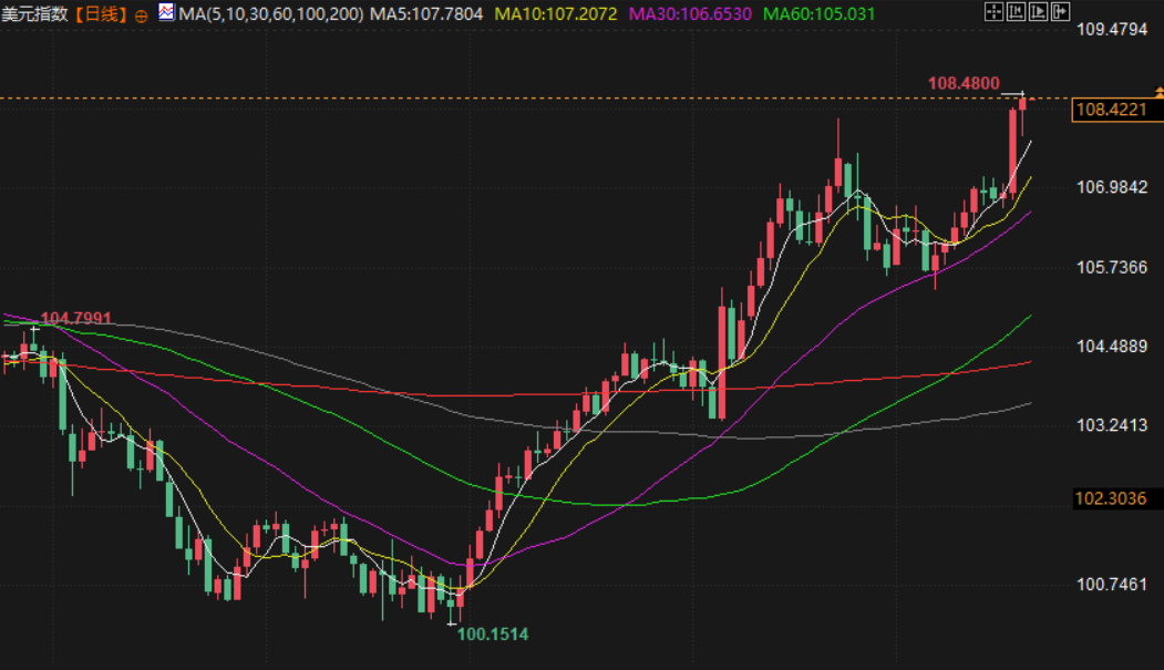 美元指数周四盘中最高触及108.480,超过上一交易日触及的108.180,这是2022年11月以来的最高水平,此前美联储降息并发出2025年货币政策宽松轨迹将放缓许多的信号;而在日本央行维持利率不变后,日元兑美元走软。