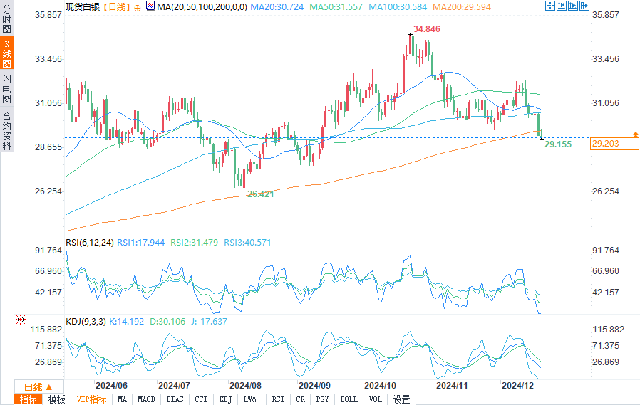 盘中小幅走跌。昨日美联储最新预测显示,2025年将降息两次,低于市场预期。美联储主席鲍威尔强调要谨慎放松货币政策以控制通胀,这提振了美元,使其触及多年高点。对白银来说,这意味着不利的环境,因为利率上升和美元走强降低了白银的吸引力。最近升破4.5%的10年期美国国债收益率不断上升,增加了另一层压力,因为这增加了持有白银等非收益资产的成本。