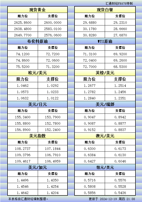 标题:12月19日美市更新的支撑阻力:金银原油+美元指数等八大货币对