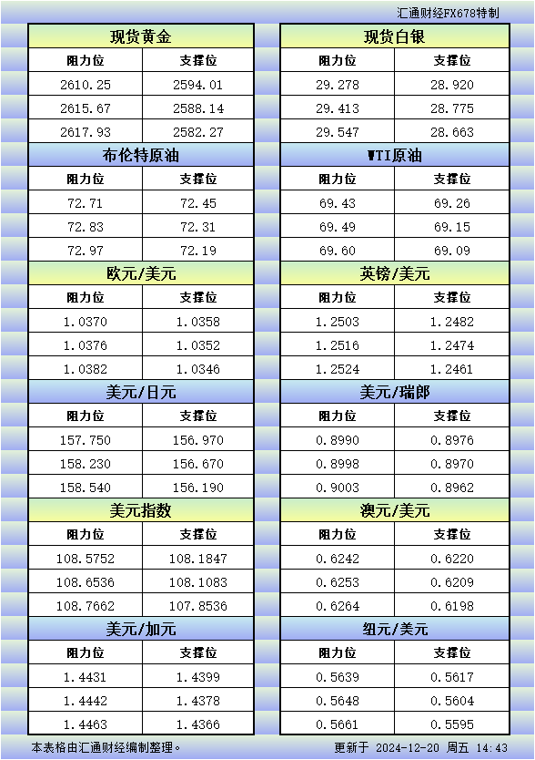 标题:12月20日欧市更新的支撑阻力:金银原油+美元指数等八大货币对