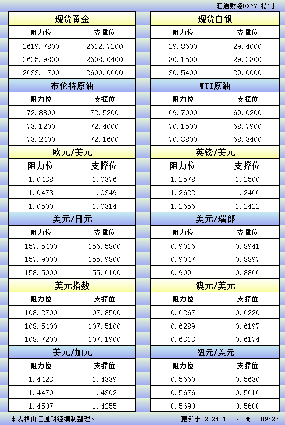 12月24日亚市更新的支撑阻力:金银原油+美元指数等八大货币对