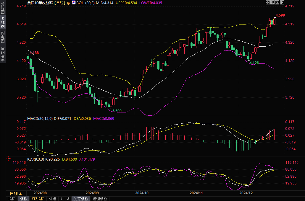 美元指数周一上涨0.4%,徘徊在两年高位附近,美元指数在五个交易日中第四日上涨,此间已累计上涨1.2%,降低了黄金对其他货币持有者的吸引力。"市场继续消化联邦公开市场委员会(FOMC)上周会议的结果,"Zaner Metals副总裁兼高级金属策略师Peter Grant表示:"现在市场正在考虑2025年的较浅利率路径,可能会在1月份暂停降息,也许3月份也会暂停。"