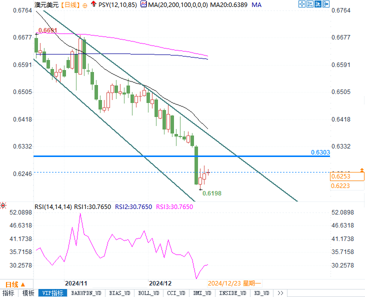 澳元兑美元可能测试下降通道的下限,支撑位于0.6120附近;