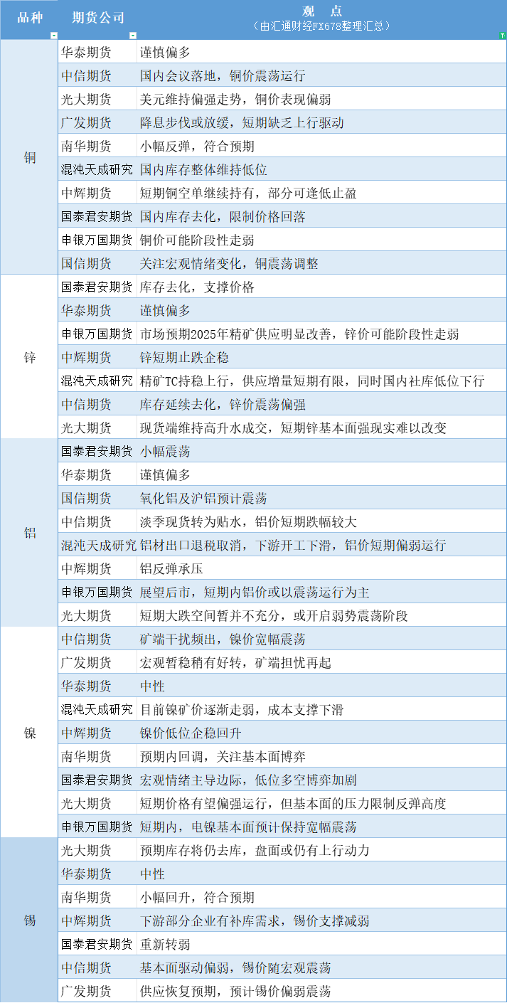期货公司观点汇总一张图:12月24日有色系(铜、锌、铝、镍、锡等)