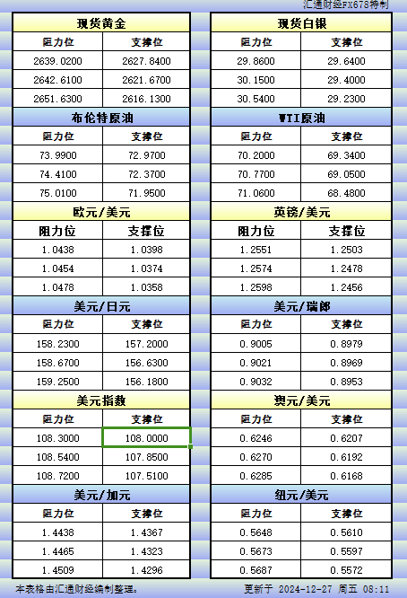 标题:12月27日亚市更新的支撑阻力:金银原油+美元指数等八大货币对