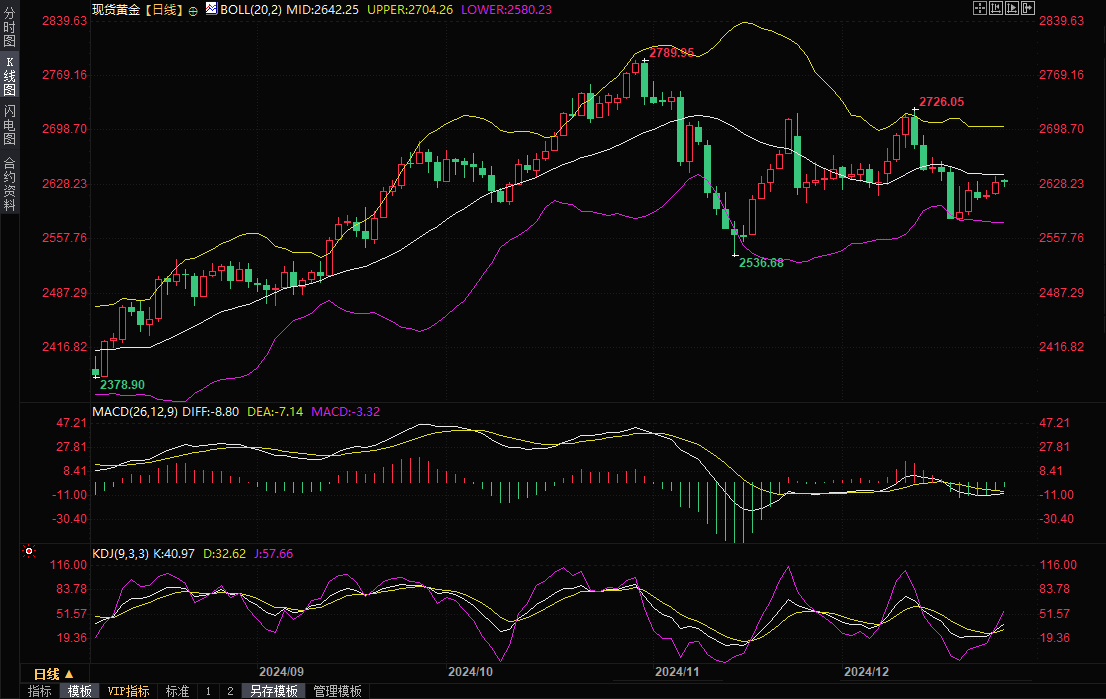 现货黄金窄幅震荡,目前交投于2632.87美元/盎司附近。金价周四在圣诞假期后的清淡交投中上涨,盘中最高曾触及2639.02美元/盎司,为近一周新高,收报2633.49美元/盎司,受避险需求推动,市场在等待即将上任的特朗普政府领导下的美国经济的以及美联储2025年利率策略的信号。