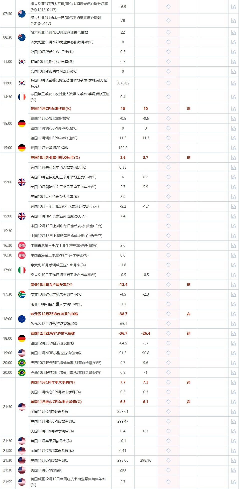 21:30 美国11月核心CPI年率未季调(%) , 前值 6.3 , 预期值 6.1 , 公布值:待发布21:30 美国11月CPI读数未季调 , 前值 298.01 , 预期值 -- , 公布值:待发布