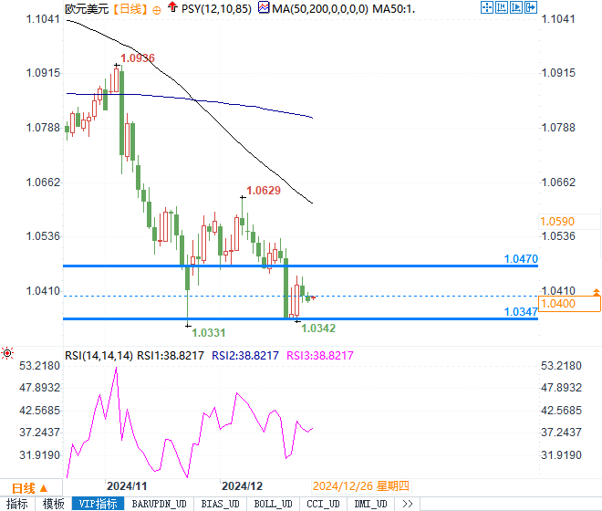 最新公布的美国经济数据表现复杂。11月耐用品订单环比下降1.1%,暗示制造业活动可能放缓。同时,12月消费者信心指数从上月的111.7下降至104.7,反映出消费者信心的下滑。然而,这些指标对美元影响有限(当前假期交易环境较为平静)。市场参与者预计,随着假期继续,交易量将保持低迷,美元价格波动可能较为有限。
