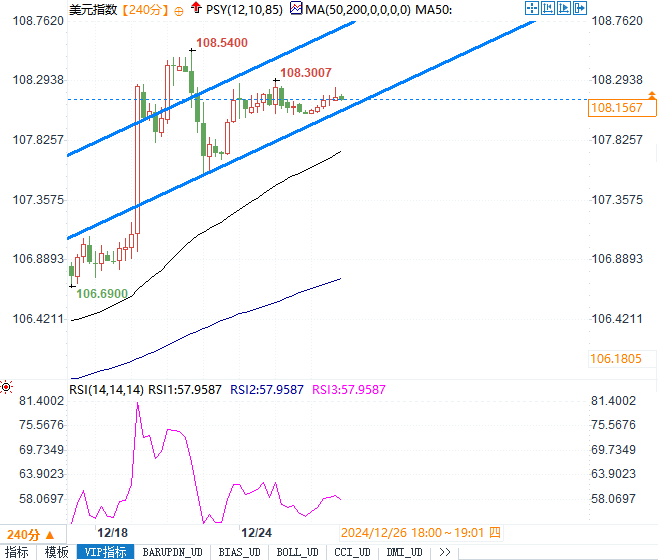 美元指数当前在108.15附近,受美债收益率接近4.6%以及2025年美联储降息预期减少的支撑。这一表现显示出市场对美国经济的信心,美元接近两年来的高位。