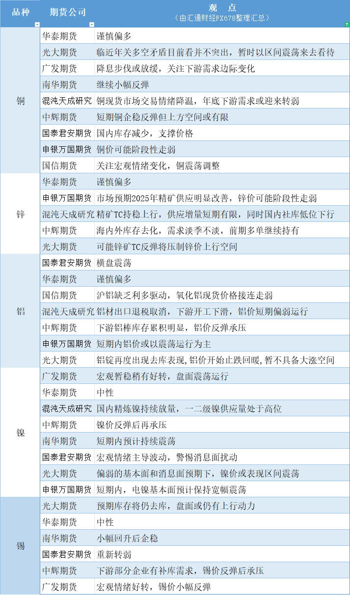 期货公司观点汇总一张图:12月26日有色系(铜、锌、铝、镍、锡等)