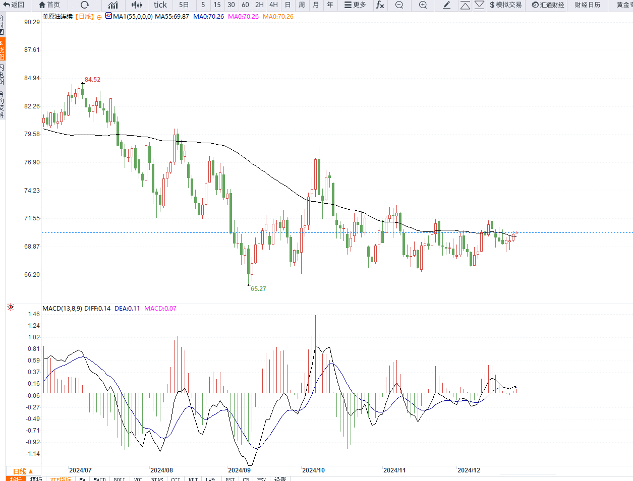 美原油亚盘时段小幅上涨,交投于70.28美元/桶附近,基本面上圣诞节前油价小幅反弹至70美元上方,主要是市场对于亚洲国家的需求预期存在回暖的可能性。