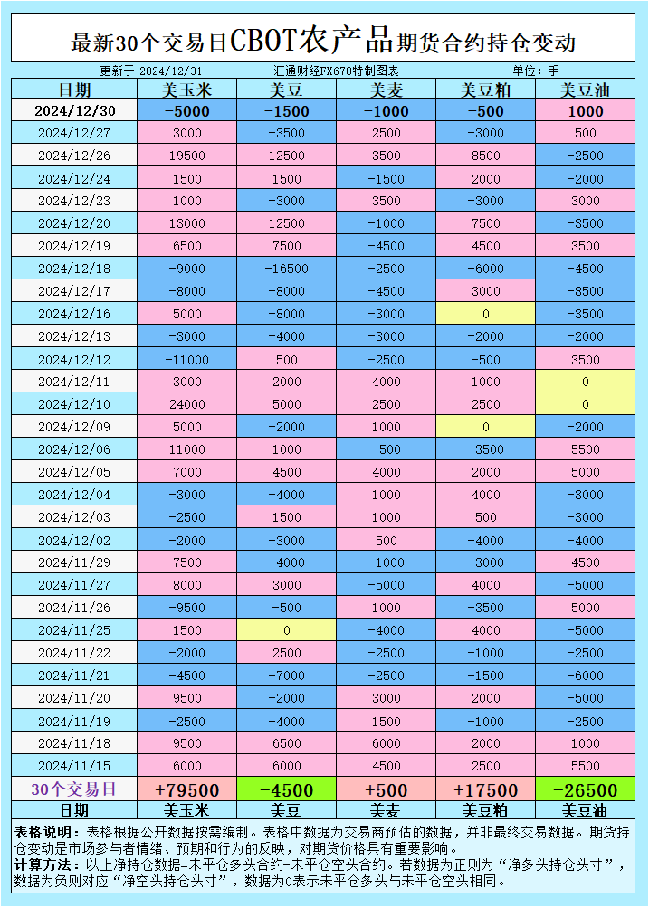 增加CBOT玉米投机性净多头;增加CBOT大豆投机性净多头;增加CBOT小麦投机性净多头;增加CBOT豆粕投机性净多头;CBOT豆油未平仓多头与未平仓空头相同;