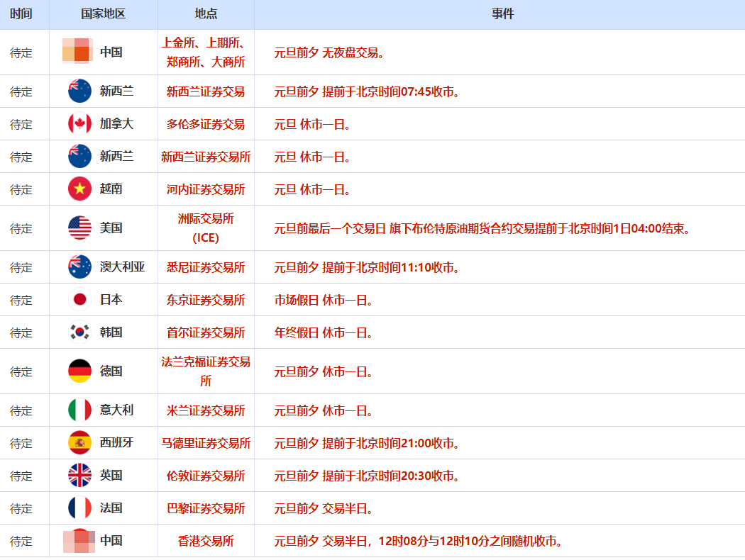 日内重点关注:中国12月官方制造业PMI、瑞士11月官方储备资产。假日提醒