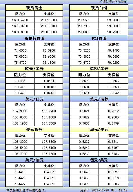 标题:12月30日亚市更新的支撑阻力:金银原油+美元指数等八大货币对