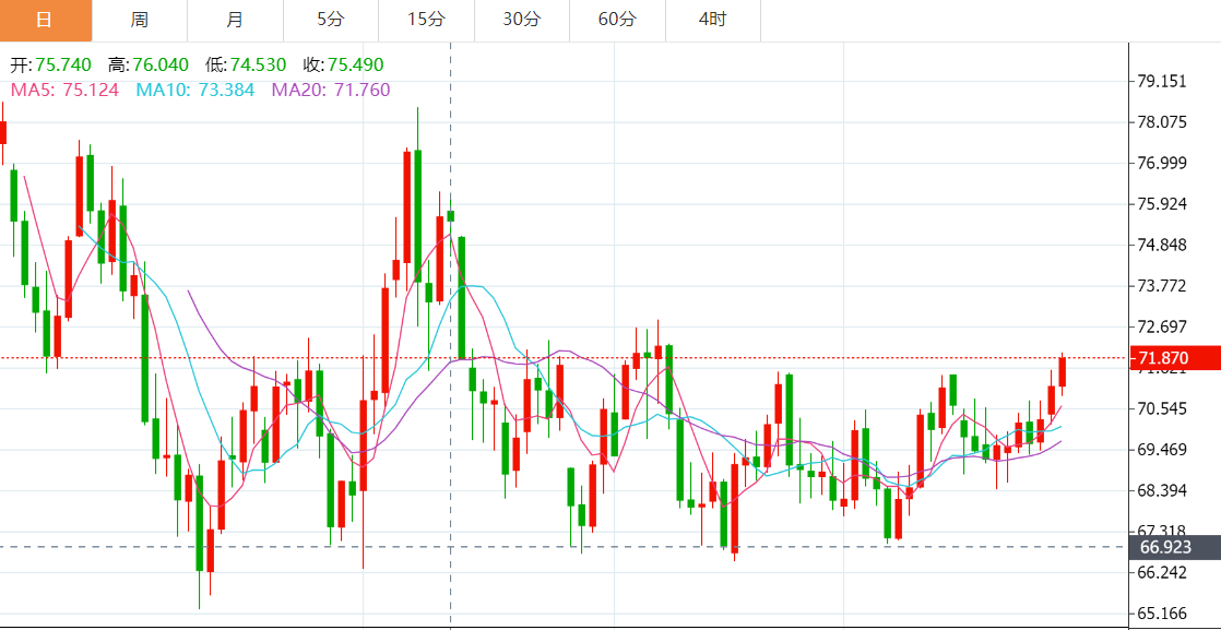 布伦特原油期货结算价上涨0.88%,至每桶74.64美元。美国原油结算价上涨1.03%,至每桶71.72美元。