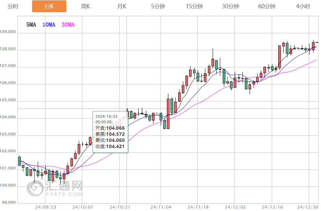 美元兑日元最新上涨 0.29%,至 157.28,实现 11.5% 的年度涨幅。欧元下跌 0.52% 至 1.0353 美元,录得6.2% 的年度跌幅,交易员预计欧洲央行的降息幅度将比美联储更大。