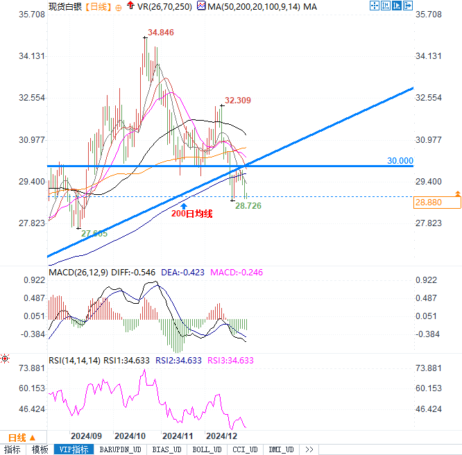 潜在形态分析:从图表中可以看出,白银市场可能已经形成了一个“头肩顶”形态,其颈线位于30美元以下。这一形态无疑为市场提供了更多的看跌依据,一旦价格跌破颈线并确认下行趋势,白银可能会迅速下探至26美元的水平。