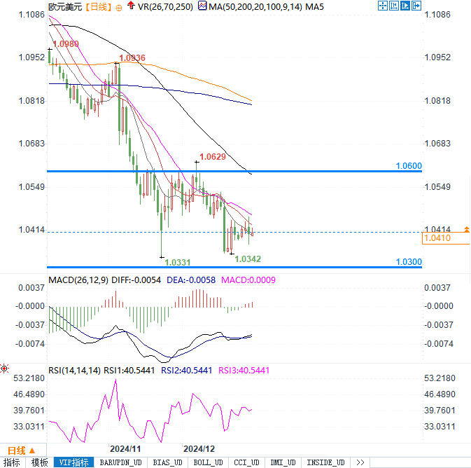 总结综上所述,从基本面和技术面分析来看,欧元/美元目前仍处于下行趋势中。美元的强势主要受益于利率优势和避险需求,而欧元则因欧元区经济疲软和降息预期而承压。在技术面上,1.03和1.06分别构成关键的支撑和阻力位,汇价在此区间内震荡运行。