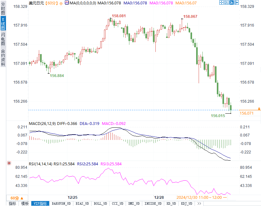 美元兑日元(USD/JPY)继续承压,延续了其三连跌的走势。日内最低触及156.015,市场情绪紧张,原因之一是投资者对日本央行(BoJ)可能在2025年1月上调利率的预期逐渐升温。此外,美债收益率下滑也对美元产生了一定的负面影响,导致美元在短期内出现回调。