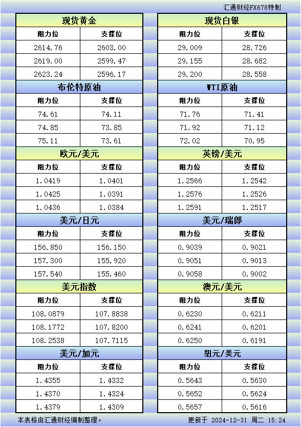 12月31日欧市更新的支撑阻力:金银原油+美元指数等八大货币对